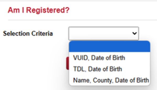 Search using (VUID & Date of Birth or TX Drivers License Number & Date of Birth or Name, County & Date of Birth.